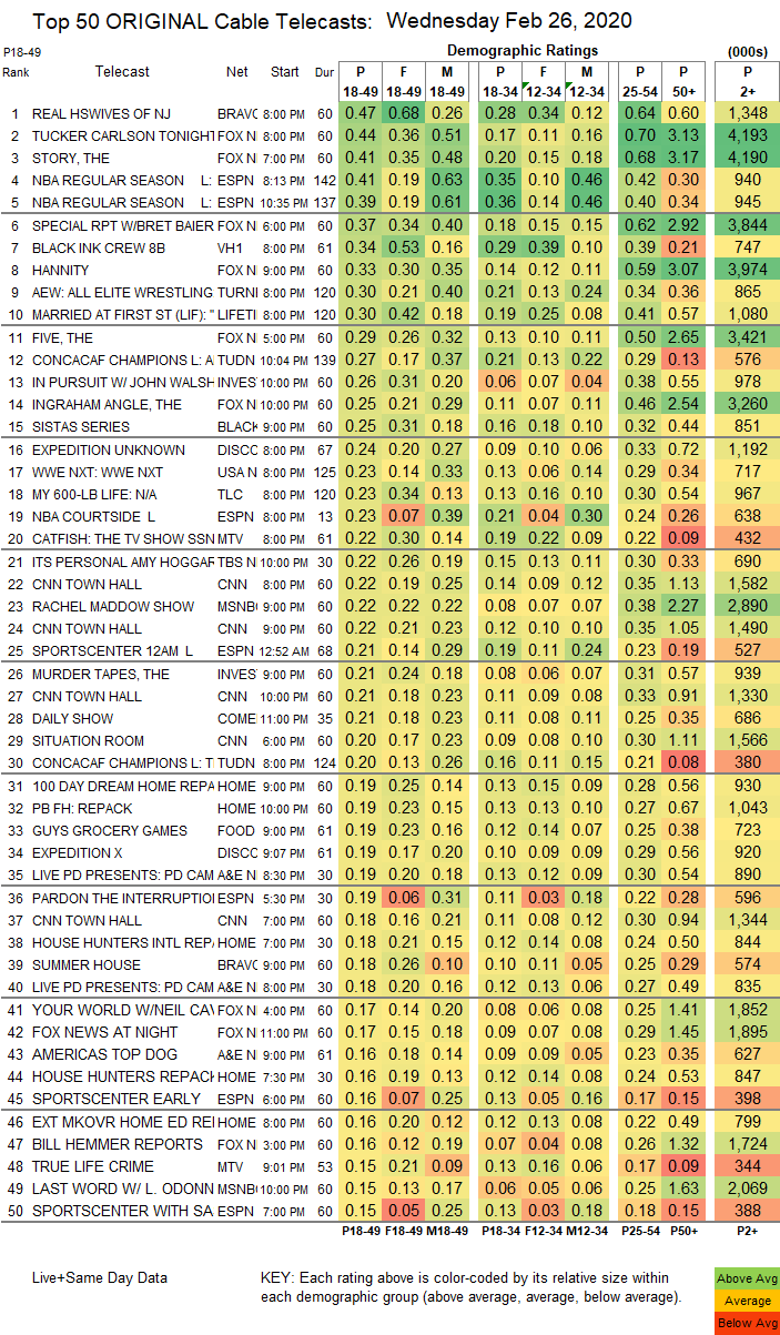 AEW Dynamite drew 865,000 viewers overall (which is down from last week’s 893,000) and came in at No. 9 for the night. That’s down from No. 5 last week. “Real Housewives of New Jersey,” Tucker Carlson, “The Story,” two NBA games, a Fox News special report, “Black Ink Crew,” and “Hannity.”