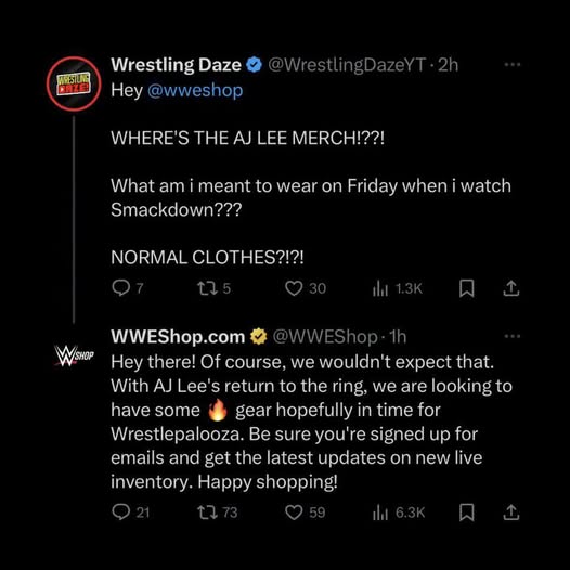 Amid all the speculation, WWE Shop appears to have spoiled Lee’s potential return. When YouTuber Wrestling Daze asked if WWE had AJ Lee’s merch for them to wear for SmackDown this Friday, they got the following response: